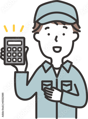 Obraz premium 帽子をかぶった作業服の男性が電卓を持っているイラスト
