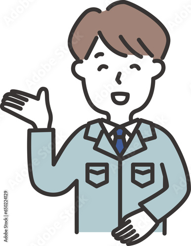 Obraz premium 作業服にネクタイをした男性がこちらと案内しているイラスト