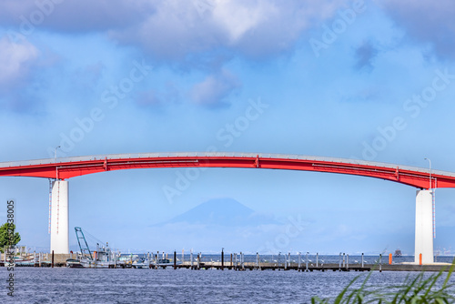 Obraz premium 海の上にかかる赤い橋と青空の中の富士山