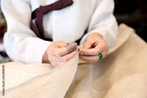 © Choi_ Nikolai, Obraz premium 한국 전통복장인 한복 명인이 한복 제작을 위해 바느질을 하고있다