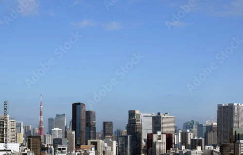 Obraz premium 東京のビジネス街と東京タワー、東京の町並みと青空