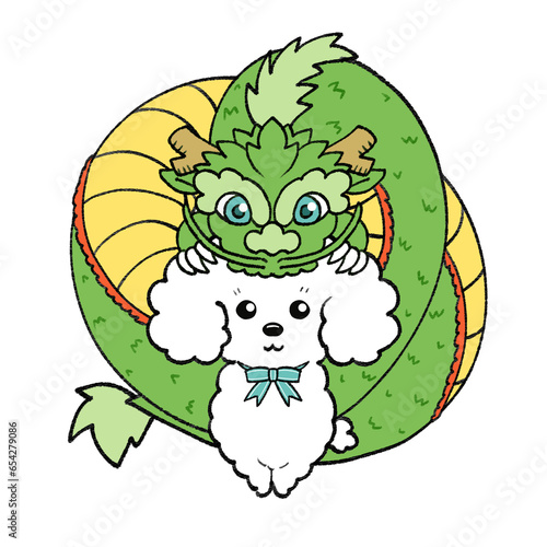 Obraz premium 緑の龍と白いトイプードルの年賀状素材