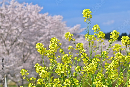 © 頼朝, Fototapeta premium 桜 菜の花 中国地方 桜並木 岡山