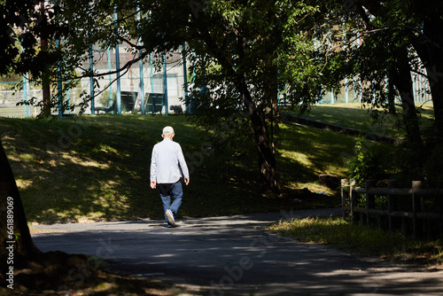 Obraz premium 秋の公園で散歩しているシニア男性の姿