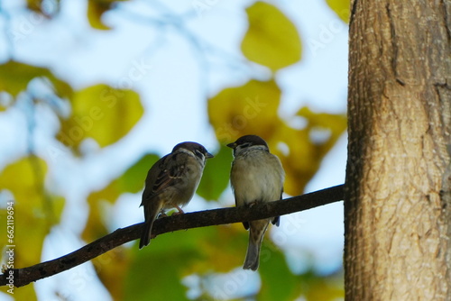 Obraz premium 木に並んで止まるスズメ