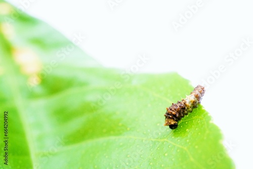 Fototapeta premium 白背景に食草の緑のレモンの葉の上で鳥の糞に擬態するナミアゲハチョウの小さな若齢幼虫