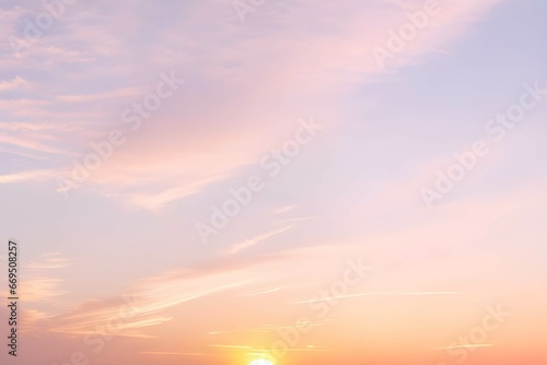 © sky studio, Obraz premium 淡いピンクとオレンジの夕焼け空に白いふわふわの雲と沈む太陽、夕暮れ時の空の色彩と雲の形の変化
