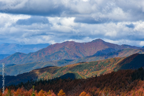 © FURISHO, Fototapeta premium 高ボッチ高原の紅葉の山と沸き立つ雲
