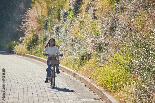 © zheng qiang, Obraz premium 秋の夕方の街で自転車を乗っている小学生の女の子の様子