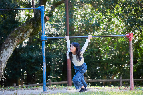 Fototapeta premium 秋の公園で鉄棒を遊んでいる小学生の女の子の様子