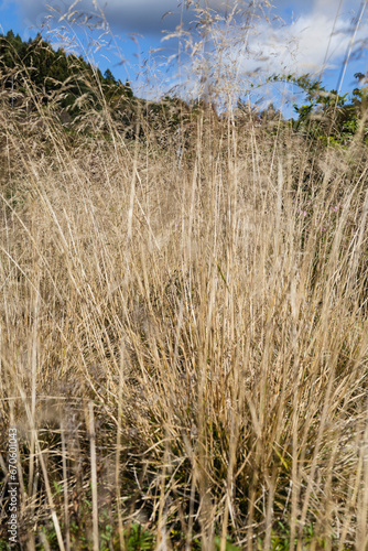 © tuo, Fototapeta premium 秋の青空の下で金色に揺れるディスカンプシア ゴールドタウ