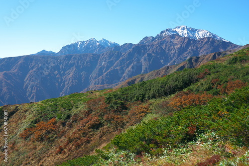 Fototapeta premium 爺ヶ岳、鹿島槍ヶ岳、五竜岳を望む八方尾根の紅葉
