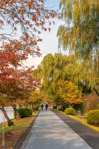 Obraz premium 茨城県水戸市 紅葉映える千波湖の朝
