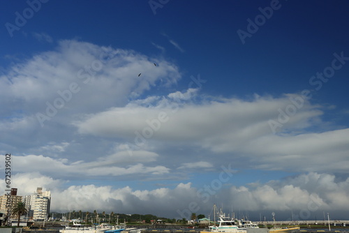 Obraz premium 青空と雲の片瀬漁港周辺の風景
