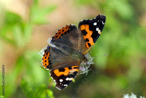 © SAIGLOBALNT, Obraz premium フジバカマの花から旧蜜する羽を広げたアカタテハ蝶(自然光・マクロレンズ接写)