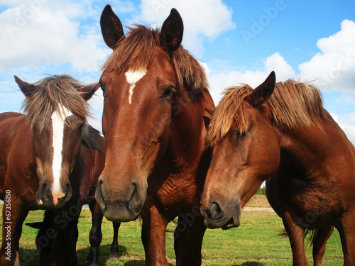 © svetlanistaya, Obraz premium Три лошади тянутся к камере, на лугу