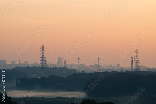 Obraz premium 夜明けの靄たなびく郊外の風景