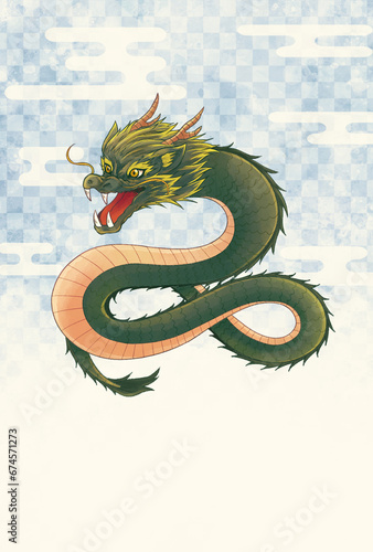 © アオフジマキ, Obraz premium 和柄の背景に龍のイラストの年賀状向け素材