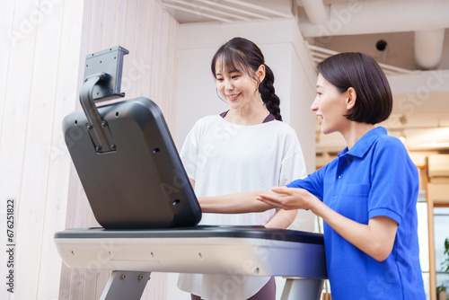 Fototapeta premium スポーツジムで運動する女性とトレーナー(ランニングマシン)
