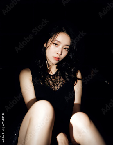 © Dalcefo, Fototapeta premium 어두운 장소의 콘트라스트가 강한 앉아있는 아시아 여성의 사진