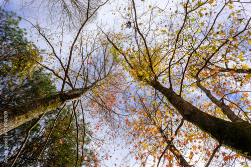 © Takamori Miyagishi , Fototapeta premium 秋の紅葉が進み、葉が落ちていく晩秋。晴れた日に神戸森林植物園で撮影