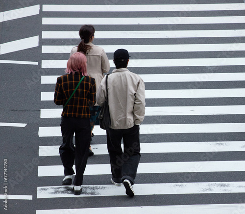 Obraz premium 都市の交差点の横断歩道を渡る若者たちの姿