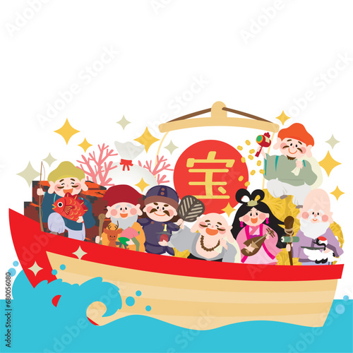 Obraz premium 七福神を乗せて海を進む宝船のお正月用ベクターイラスト