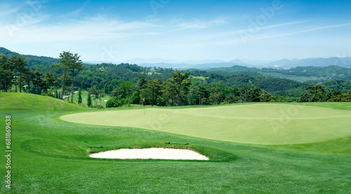 © Lee, Fototapeta premium 골프, 골프장, 그린, 깃대, 홀컵, 파노라마