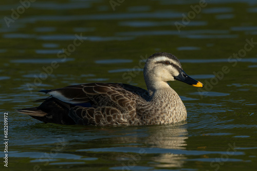 Obraz premium 西に傾き始めた太陽の光を浴びるカルガモ