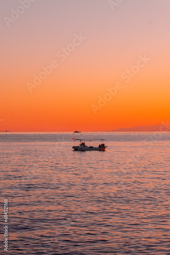 Naklejka premium 夕焼けの海に浮かぶ船
