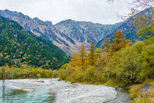 © 阿部 賢治, Obraz premium 秋の穂高連峰と梓川
