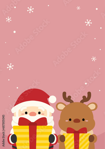 Fototapeta premium 雪のフレームとプレゼントを持つサンタとトナカイ、背景ピンク