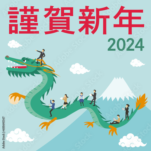 Obraz premium 2024年度の辰とそれに乗る人々の年賀状_正方形_謹賀新年_ゴシック_学校版