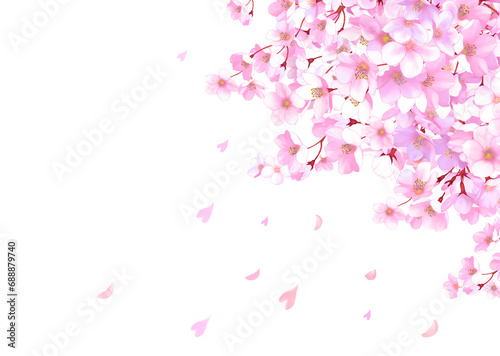 Fototapeta premium 桜と舞い散る花びらのフレーム 桜吹雪 飾り枠 素材 お花見 入学 卒業 入園 卒園 ひな祭り ひなまつり 白背景 白バック