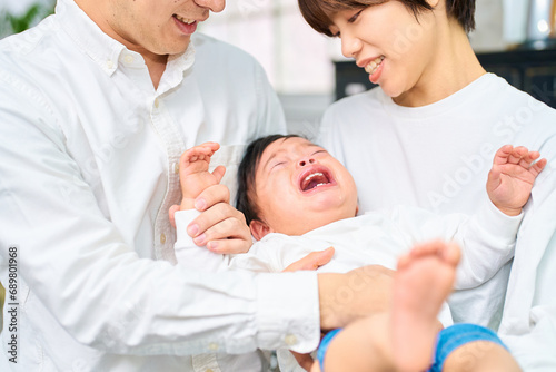 Obraz premium 泣く赤ちゃんと抱きかかえる両親