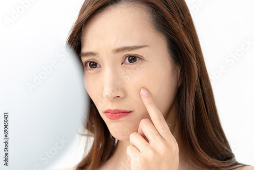 Fototapeta premium 鏡を見てお肌が気になる女性