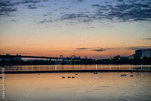 Obraz premium 朝日が昇りあたりはオレンジ色に染まる。兵庫県西宮市の香櫨園浜で撮影。