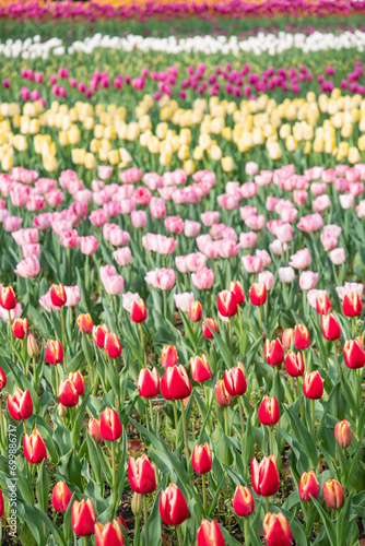 Obraz premium カラフルなチューリップの花が咲いた花壇の風景。