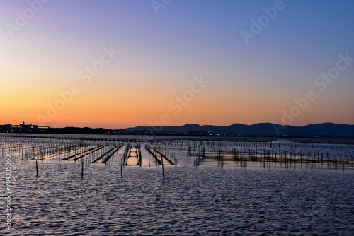 © FURISHO, Obraz premium 浜名湖の夕日と海苔養殖場
