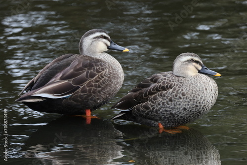 © Signyamo, Obraz premium 池の人工物の上に立つカルガモ