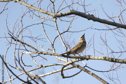Fototapeta premium 晴れた日に木の枝にとまるツグミ