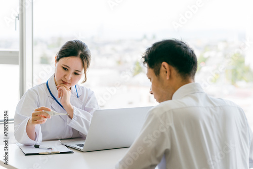 © buritora, Fototapeta premium 体温計で体温を確認する女性医師・医者と男性患者(発熱・風邪・体温)