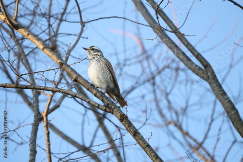 Fototapeta premium 晴れた日に木の枝にとまるツグミ