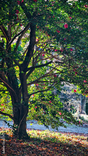 © megustaelbosque2020, Fototapeta premium 艶やかな緑色の葉に囲まれて、美しく咲くツバキの花