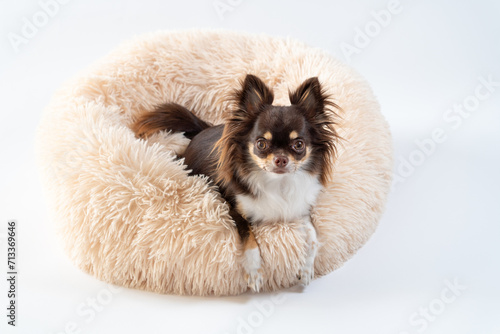 © kasa, Obraz premium ベッドの上でくつろぐ犬のチワワ|白背景