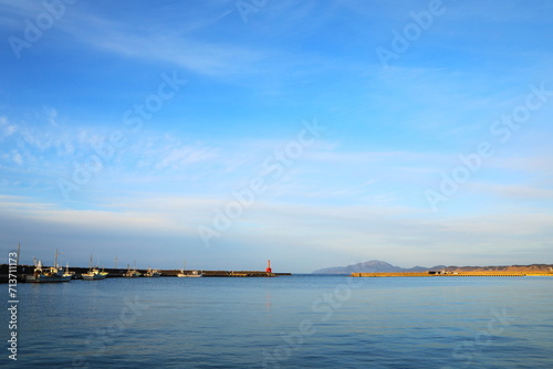 © 写真小僧, Obraz premium 赤い灯台がある小さな漁港
