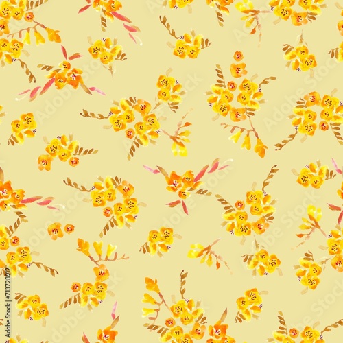 © studio-arack, Obraz premium 花柄、フリージアのシームレスなパターン、春のイラスト、テキスタイル、壁紙、包装紙、
