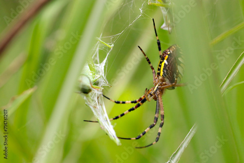 Fototapeta premium 瞬く間にバッタを簀巻きにする雌のナガコガネグモ(マクロレンズ使用・自然光・接写写真)
