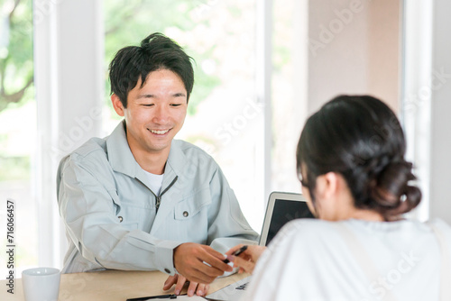 Fototapeta premium 作業着姿の工務店・設備屋・水道屋の男性と話を聞く主婦(相談・契約・打ち合わせ)