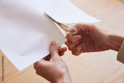 © west_photo, Obraz premium ハサミで紙を切る女性の手元